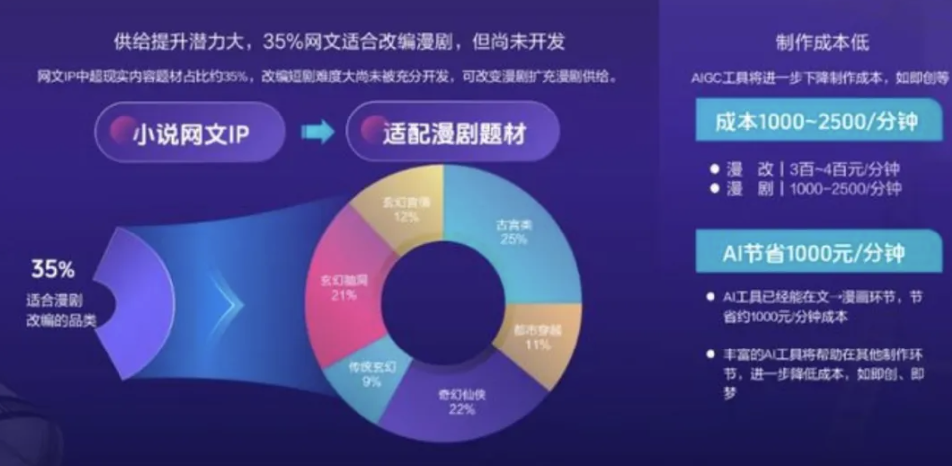 例如,閱文集團(tuán)的“漫劇助手”AIGC工具,使得7人團(tuán)隊(duì)在兩個(gè)月內(nèi)可交付3部精品漫劇,單部成本控制在10萬(wàn)—20萬(wàn)元之間,效率比傳統(tǒng)模式提升了10倍。