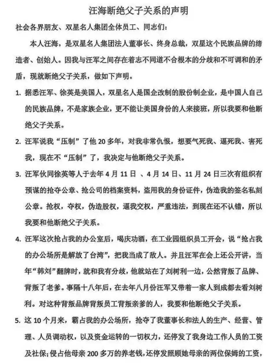 84歲的雙星名人集團(tuán)創(chuàng)始人汪海發(fā)布聲明,宣布與兒子汪軍、兒媳徐英斷絕父子及姻親關(guān)系。在聲明中,汪海列舉了11條理由,“接班人國籍”被置于首位。他表示,汪軍與徐英均為美國身份。雙星名人是國企改制后的股份制企業(yè),屬于中國人的民族品牌,絕不能讓“美國身份的人”接班。這一身份爭議,是自己宣布斷絕父子關(guān)系的底線理由。他將徹底打破“血緣接班”的傳統(tǒng),成立“雙星名人品牌接班委員會”,主張“能人接班”和“職業(yè)經(jīng)理人接班”。