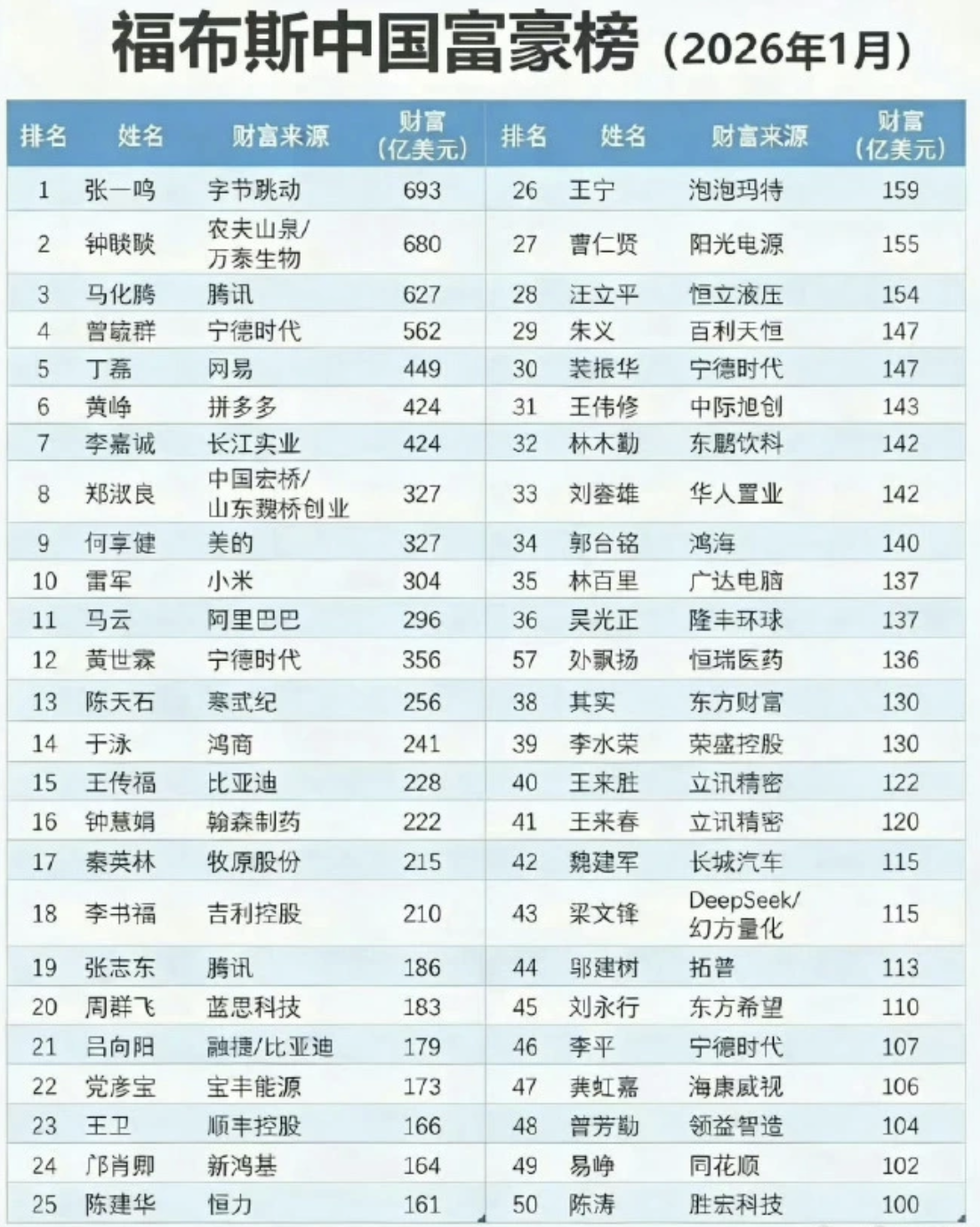 近日,福布斯中國(guó)富豪榜進(jìn)行了更新。字節(jié)跳動(dòng)創(chuàng)始人張一鳴以693億美元財(cái)富首次登頂,農(nóng)夫山泉鐘睒睒、騰訊馬化騰分列二、三位。小米創(chuàng)始人雷軍以304億美元財(cái)富重返前十,略超阿里巴巴創(chuàng)始人馬云的296億美元。此外,比亞迪王傳福、順豐王衛(wèi)、泡泡瑪特王寧、長(zhǎng)城汽車魏建軍與DeepSeek創(chuàng)始人梁文峰分別以228億、166億、159億、115億、115億美元的身家,位列第15、23、26、42和43位。