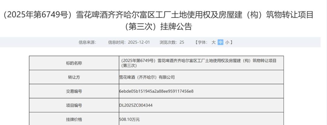 12月初,時(shí)代財(cái)經(jīng)在大連產(chǎn)權(quán)交易所看到,雪花齊齊哈爾富區(qū)工廠土地使用權(quán)及房屋建筑物進(jìn)行三次轉(zhuǎn)讓,轉(zhuǎn)讓價(jià)從9月的635萬降至508萬,降價(jià)超120萬。
