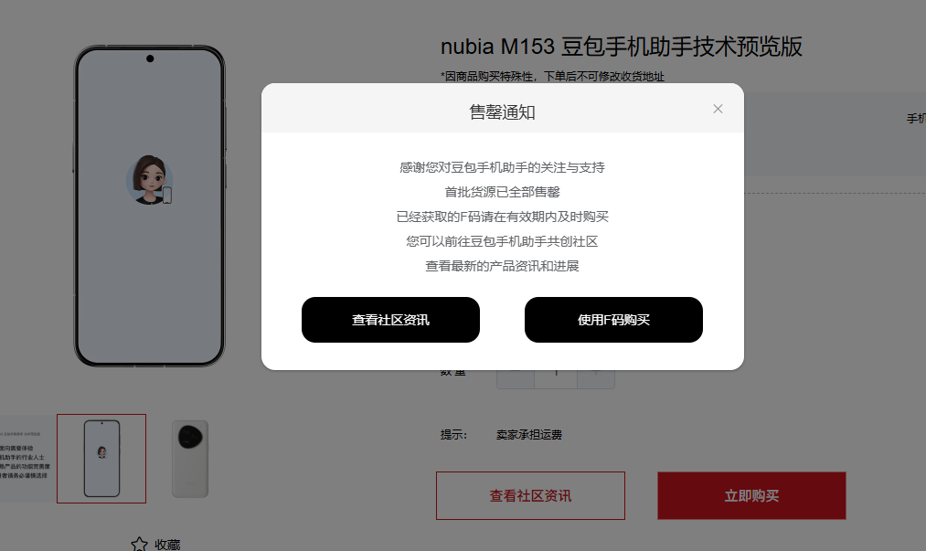 12月16日,從中興商城官網(wǎng)信息可知,豆包手機助手及其合作機型nubiaM153已重新開啟F碼候補申請通道,正式恢復(fù)該產(chǎn)品的購買資格。