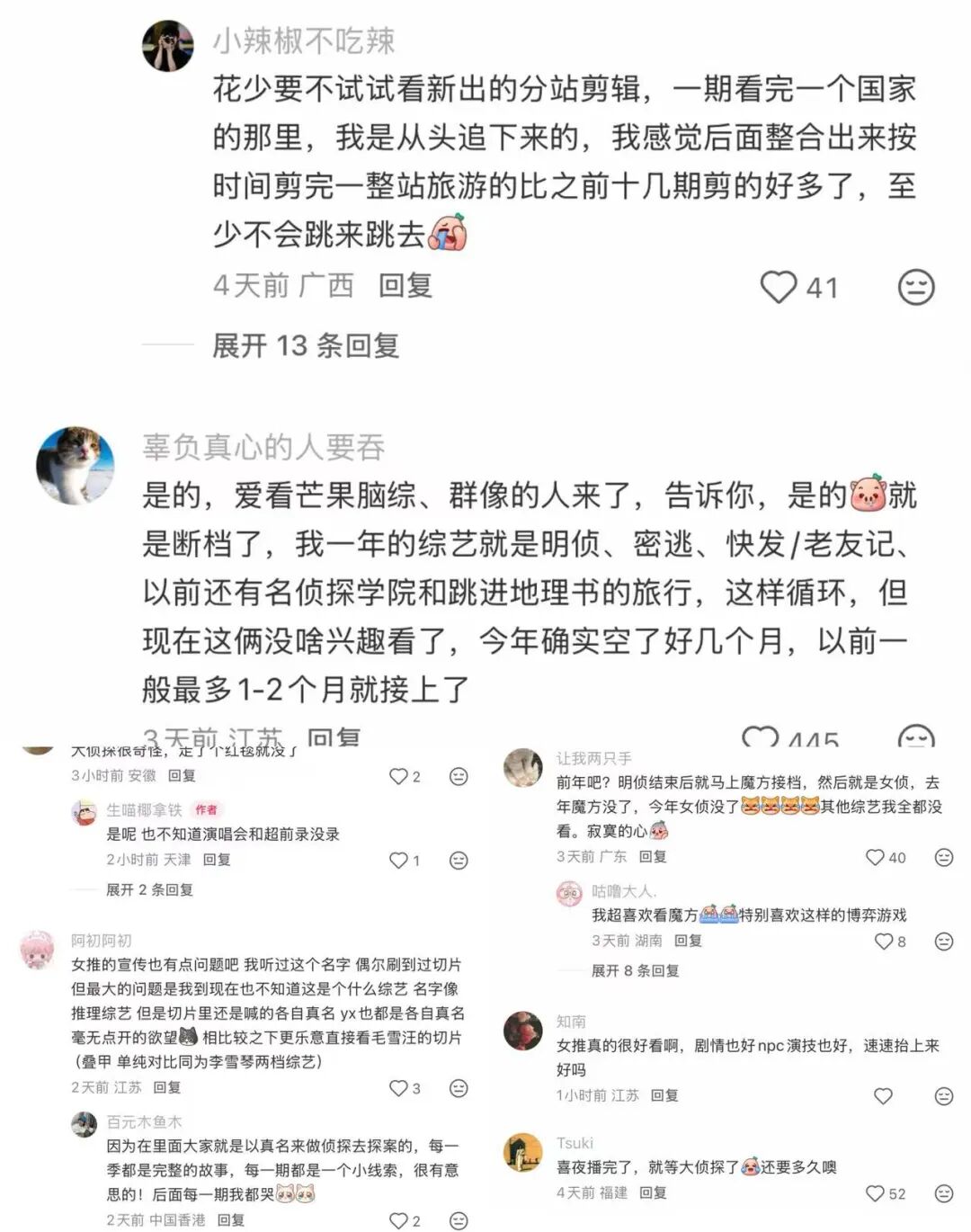 《明星大偵探》回歸一再后移,補(bǔ)位的《女子推理社》《魔方新世界》也未穩(wěn)定輸出,芒果開辟的推理綜黃金檔期迎來(lái)空窗期。