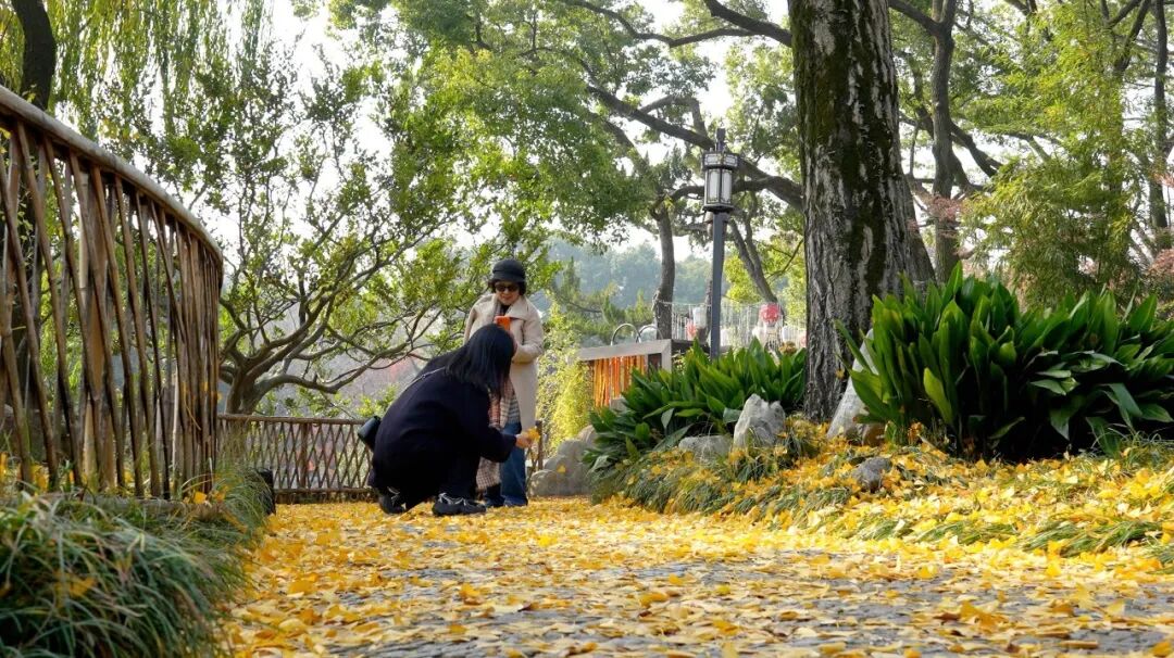 為了讓游客有更豐富的游園體驗,園方在秋冬景致的打造上增添了不少細節(jié):水面上的殘荷被特意保留,勾勒出獨特的線條美感;飄落的銀杏葉被歸攏成一片,鋪就出滿地金黃。這些用心的布置,為攝影愛好者和漫步的游客提供了多樣的取景畫面和舒適的游園感受。