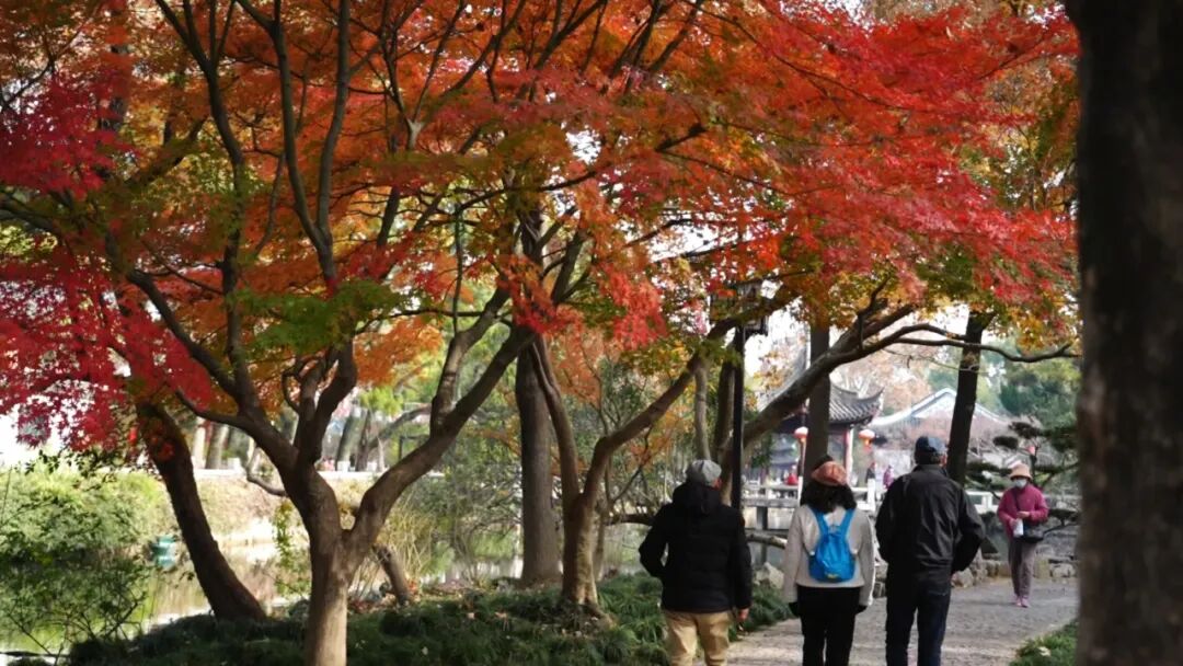 進入12月,嘉定街頭寒意漸濃,但上海古猗園內卻別有一番景致:紅楓似火、水杉鎏金,這些絢爛的植物與園內古典建筑相映成趣,獨特的秋冬風光吸引了不少市民前來游覽觀賞。