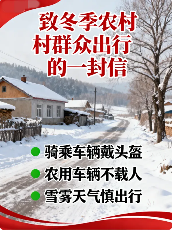 平安是福,安全第一。農(nóng)村朋友們,冬季出行多一份小心,家人就多一份安心。讓我們共同樹立安全出行意識,自覺遵守交通法規(guī),讓每一次出行都成為平安的旅程。
