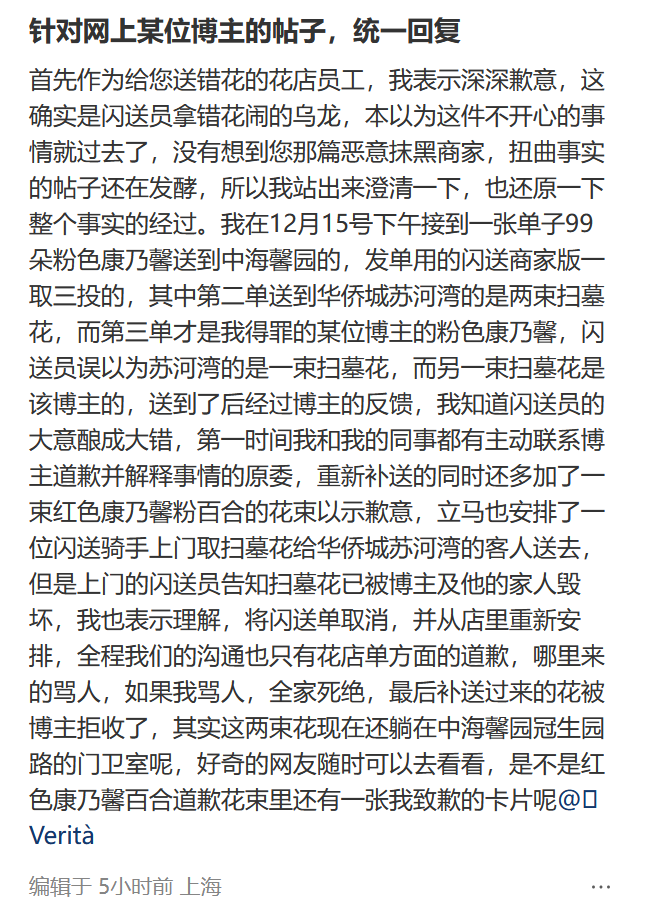 12月15日,上海一名高中生劉同學(xué)本想為母親購(gòu)買康乃馨慶祝生日,沒(méi)想到收到的卻是一束標(biāo)注著“緬懷逝者”字樣的菊花。事后店家雖提出補(bǔ)發(fā)兩束鮮花,卻被劉同學(xué)拒絕。