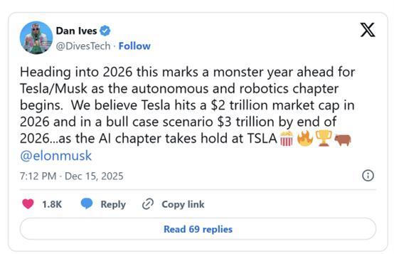 他預(yù)計,到2026年特斯拉市值將達(dá)2萬億美元,較當(dāng)前水平提升約33%;若處于樂觀情境,該數(shù)值甚至可能在2026年底攀升至3萬億美元。