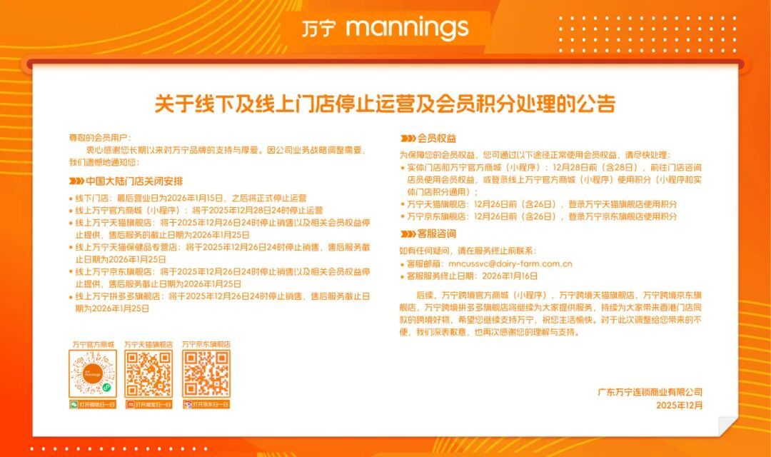 近日,萬寧中國通過官網(wǎng)宣布全面退出內(nèi)地市場,線下門店與線上平臺將陸續(xù)停止運(yùn)營。公告顯示,線下門店最后營業(yè)日為2026年1月15日;線上渠道中,萬寧官方商城小程序于2025年12月28日24時停運(yùn),天貓旗艦店、京東旗艦店及天貓保健品專營店則在12月26日關(guān)閉。