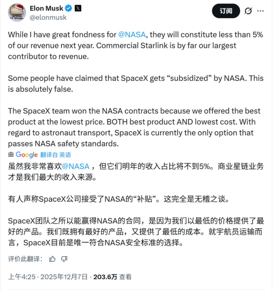不過(guò),馬斯克近期在推特中反駁了依靠與NASA的關(guān)系獲取訂單支撐業(yè)務(wù)的說(shuō)法,他提到2026年NASA訂單僅占公司總收入的5%,關(guān)鍵收入來(lái)源是商業(yè)星鏈業(yè)務(wù)。