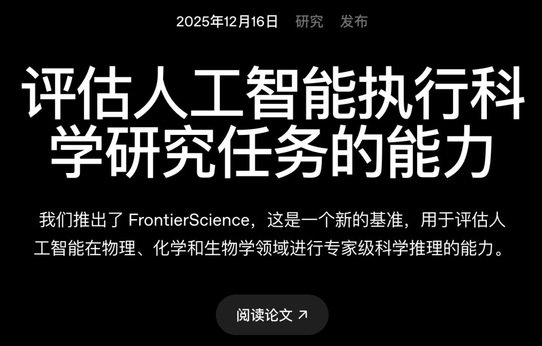 2025年12月16日,OpenAI發(fā)布了一套新基準(zhǔn)FrontierScience,用于衡量AI在物理、化學(xué)、生物三門學(xué)科中能否實(shí)現(xiàn)接近專家水平的科學(xué)推理,而非僅僅是背誦知識點(diǎn)。