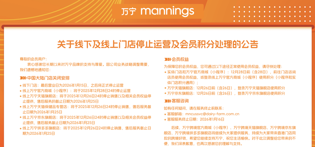 根據(jù)萬寧官網(wǎng)公告,其線下門店將于2026年1月15日停止運營;線上官方商城(小程序)于12月28日24時停運,天貓、京東、拼多多等平臺的旗艦店則在12月26日24時停止銷售,售后服務將延續(xù)至2026年1月25日。