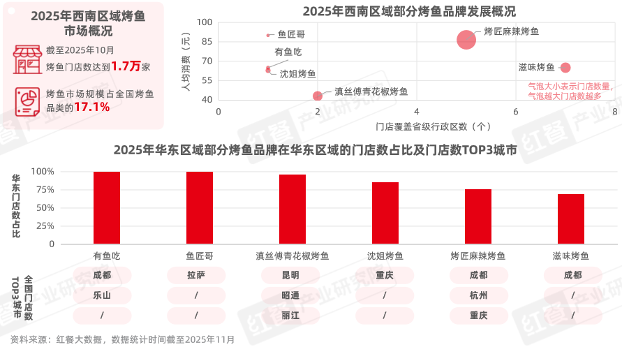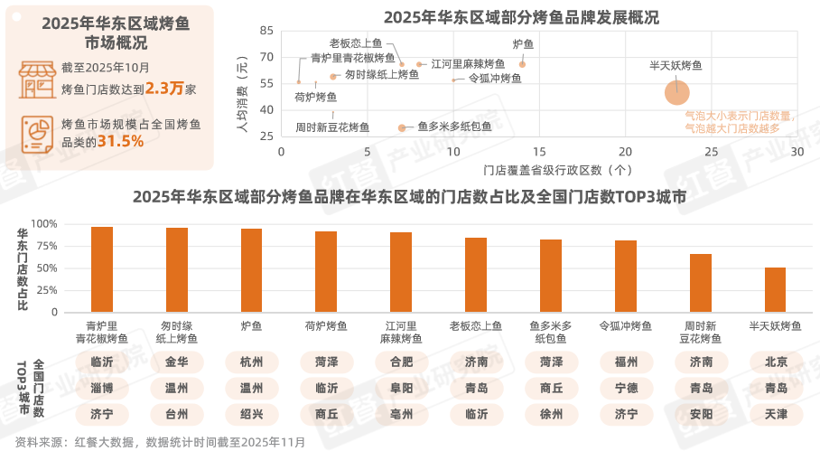 紅餐大數(shù)據(jù)顯示,截至2025年10月,華東烤魚市場份額占全國31.5%,門店超2.3萬家,半天妖烤魚、爐魚等品牌在此布局較深。半天妖華東門店占比達51.6%,并逐步向全國擴張。