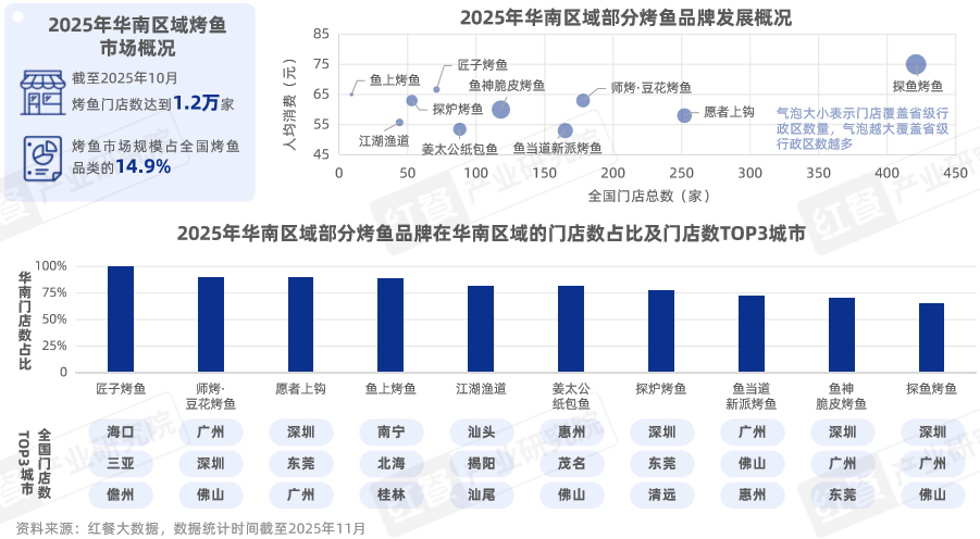 截至2025年10月,華南烤魚市場份額占全國14.9%,門店超1.2萬家,探魚烤魚、師烤·豆花烤魚等品牌扎根于此。多數(shù)品牌深耕單一省份,如匠子烤魚(海南)、愿者上鉤(廣東);部分品牌加速外擴,探魚非華南門店占比34.7%,師烤則開拓了安徽、浙江等地。