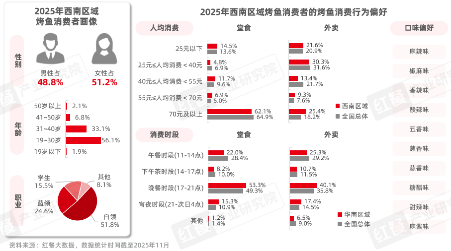 西南烤魚消費者中女性占比51.2%,19~30歲群體占比56.1%;外賣偏好40元以下或70元以上,晚餐、宵夜消費更活躍,口味上更傾向辣味。