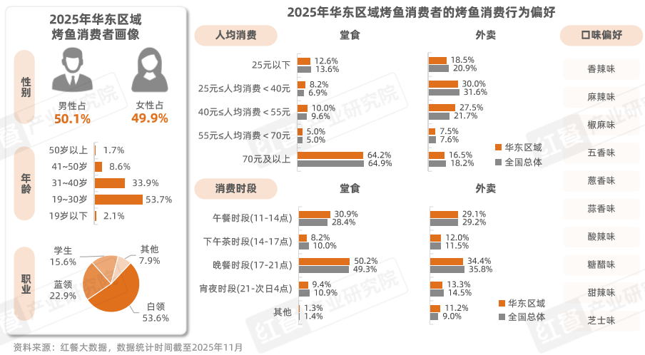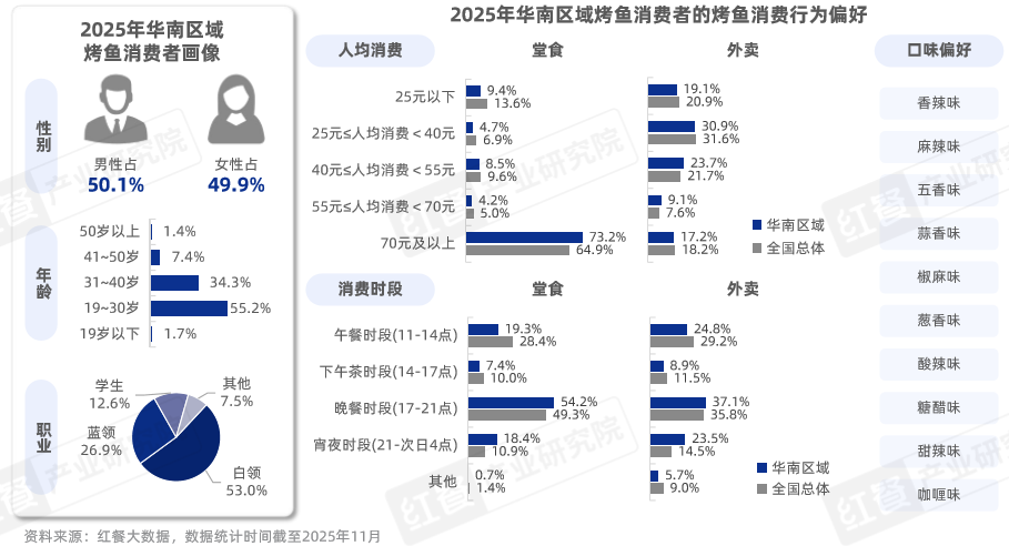 華南烤魚消費者在19~30歲、31~40歲區(qū)間占比高于華東,藍領(lǐng)群體占比也更高。堂食人均消費70元及以上占比達73.3%,夜間消費活躍,晚餐、宵夜時段占比高于全國;口味上,香辣、麻辣受歡迎,五香、蒜香等非辣味也廣受青睞。
