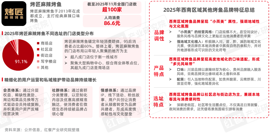 烤匠作為西南代表品牌,主打川渝麻辣口味,聚焦Z世代,通過精細化運營獲得關(guān)注,截至2025年11月門店超100家;其他品牌多呈現(xiàn)小而美、地域化、煙火氣強的特征。