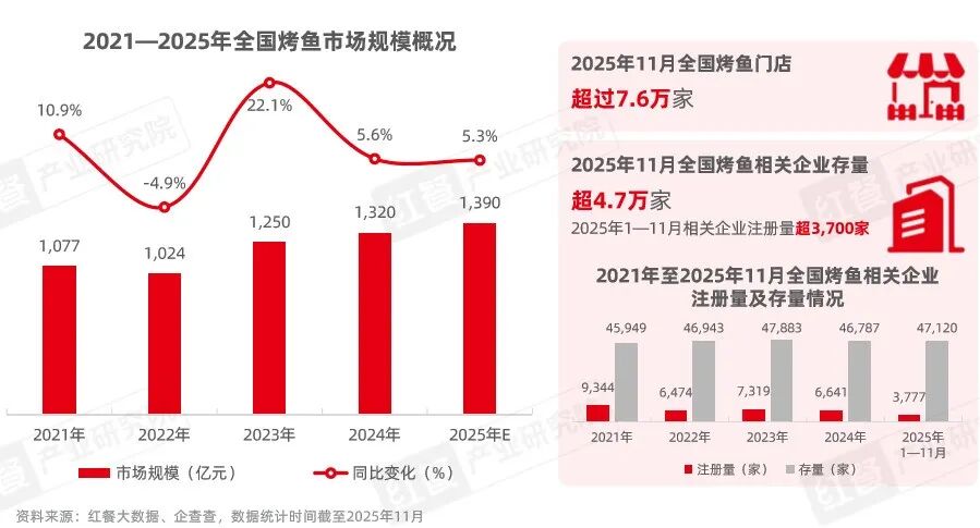 紅餐大數(shù)據(jù)顯示,2025年烤魚市場規(guī)模將延續(xù)穩(wěn)定增長態(tài)勢,預計接近1400億元。門店數(shù)量方面,截至2025年11月,全國烤魚門店超7.6萬家;企查查數(shù)據(jù)則顯示,全國烤魚相關(guān)企業(yè)存量超4.7萬家。