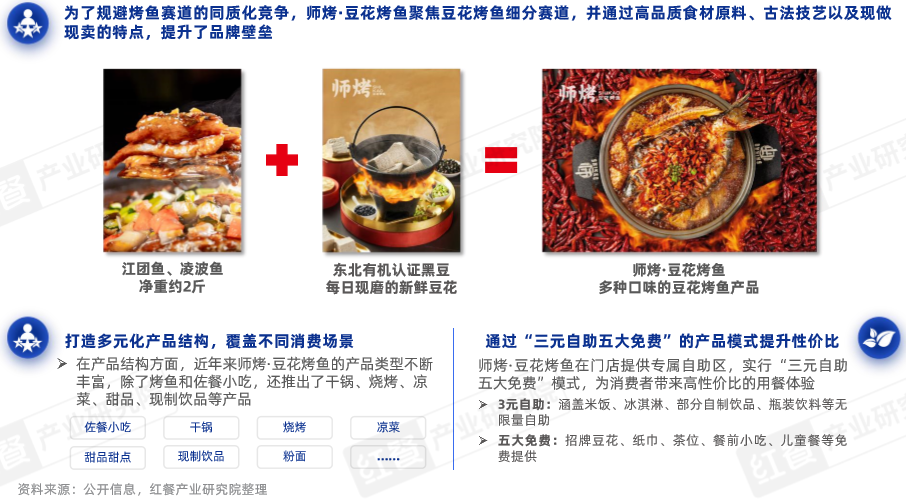 產(chǎn)品上,師烤選用2斤左右的江團魚、凌波魚,豆花采用東北有機黑豆每日現(xiàn)磨;菜單以烤魚為核心,搭配干鍋、燒烤等品類,并推出“三元自助五大免費”增值服務(wù)提升性價比。