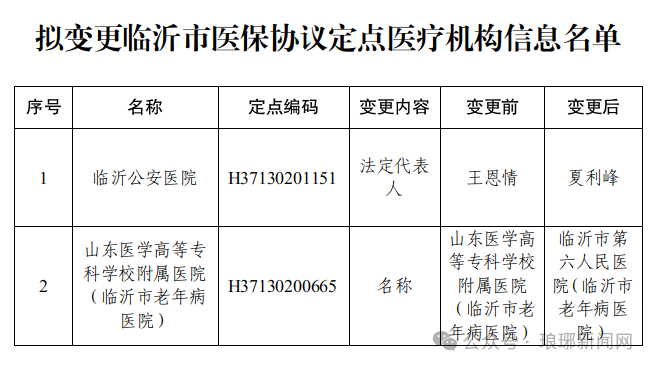 此次公示涉及兩家定點(diǎn)醫(yī)療機(jī)構(gòu)的信息變更,其中山東醫(yī)學(xué)高等??茖W(xué)校附屬醫(yī)院(臨沂市老年病醫(yī)院)擬變更名稱為臨沂市第六人民醫(yī)院(臨沂市老年病醫(yī)院)。