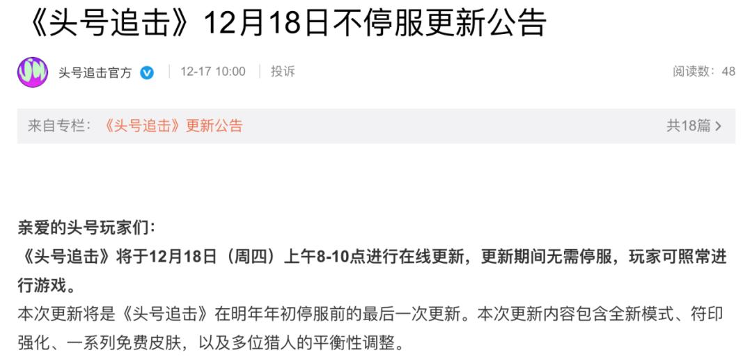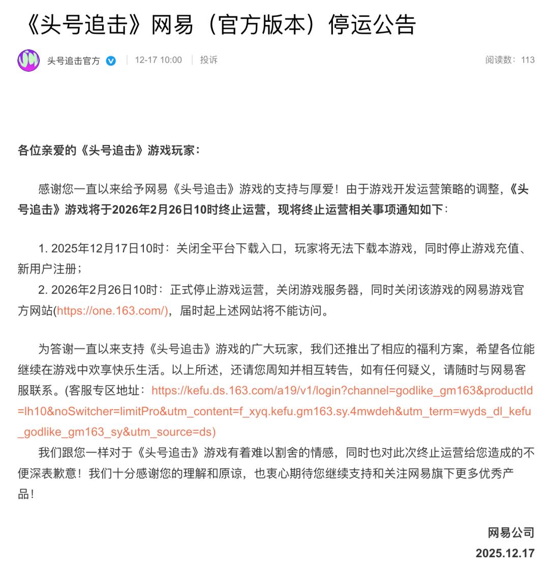 12月17日,網(wǎng)易代理的英雄大逃殺游戲《頭號追擊》發(fā)布停運公告。公告顯示,游戲將于2026年2月26日10時正式終止運營,且在公告發(fā)布當天(12月17日10時)已關閉全平臺下載入口,同時停止游戲充值與新用戶注冊服務。
