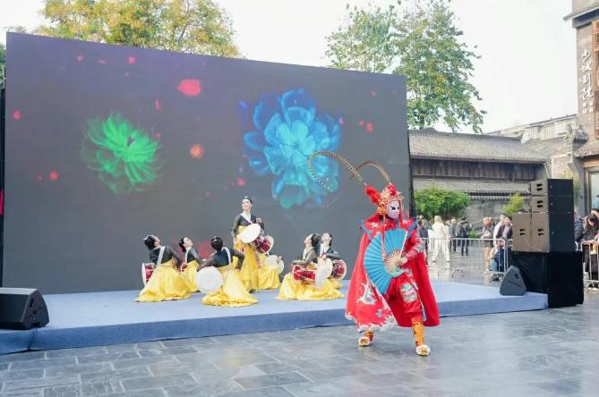獨具民族特色的表演令人沉醉。牙拍舞演員持拍輕舞,清脆拍聲與靈動舞步相映,盡顯朝鮮族舞蹈精巧韻味;男女聲二重唱《密陽阿里郎》婉轉(zhuǎn)響起,醇厚嗓音勾勒延邊風(fēng)情。最驚艷的是《長鼓舞》與川劇變臉同臺:朝鮮族舞者踏鏗鏘鼓點起舞,韻致濃郁;川劇演員隨鼓點迅捷變臉,緋紅、靛藍、金黃等臉譜流轉(zhuǎn),延蓉非遺在舞臺交融,臺下掌聲雷動。互動環(huán)節(jié)中,川劇演員體驗象帽舞,盡顯南北文化碰撞魅力。
