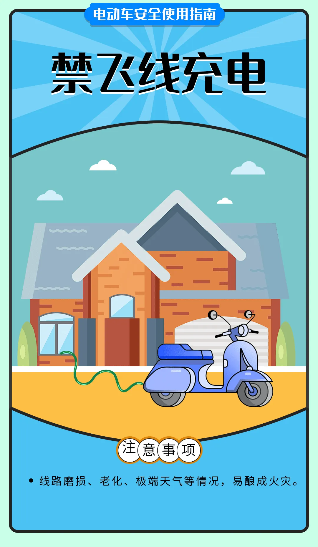 ② 私拉亂接臨時(shí)電線或從室內(nèi)拉“飛線”充電,電源線易受損起火。