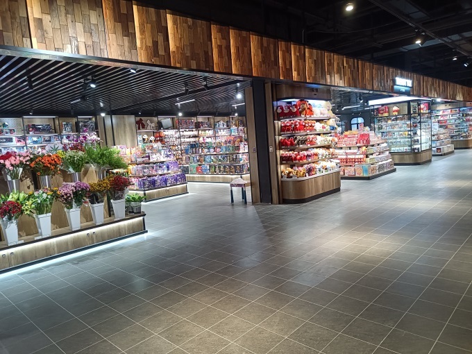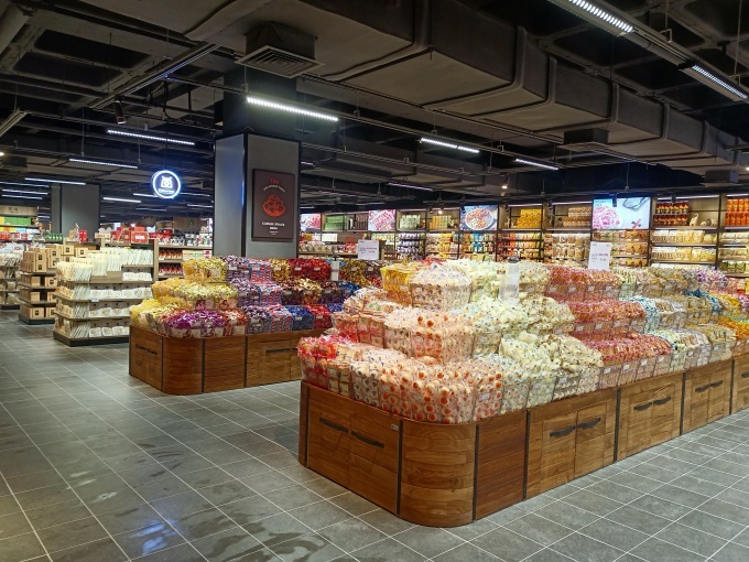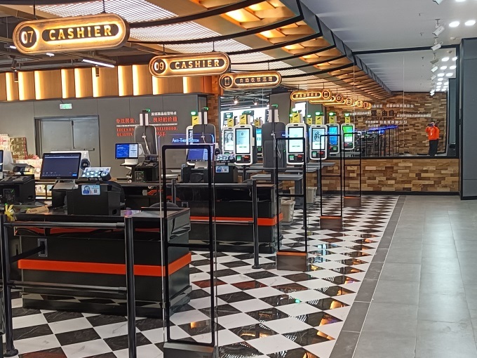 裝修參照胖東來天使城店風(fēng)格,以黑、灰、橙為主色調(diào),簡約大氣營造良好視覺感受,結(jié)合吊楣與文化標(biāo)語,打造品質(zhì)感與親和力并存的氛圍。