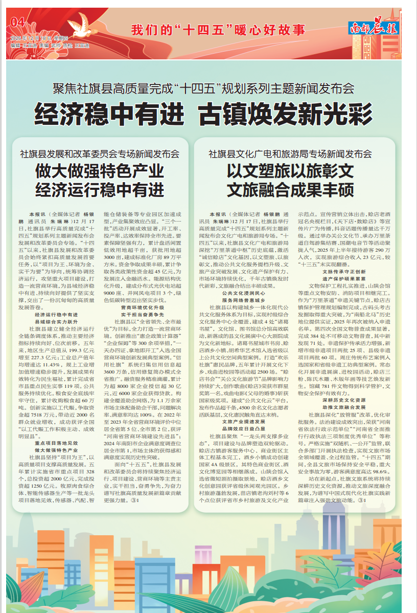 12月17日,社旗縣召開高質(zhì)量完成“十四五”規(guī)劃系列主題新聞發(fā)布會文化廣電和旅游局專場?!笆奈濉逼陂g,社旗縣文廣旅局深入挖掘“萬里茶道中樞”的歷史底蘊,激活“誠信賒店”的文化基因,通過以文化塑造旅游內(nèi)涵、以旅游彰顯文化價值的方式,推動公共文化服務升級、文旅產(chǎn)業(yè)突破發(fā)展、文化遺產(chǎn)有效保護、市場環(huán)境不斷優(yōu)化,讓千年古鎮(zhèn)展現(xiàn)新風貌,文旅融合收獲豐富成果。