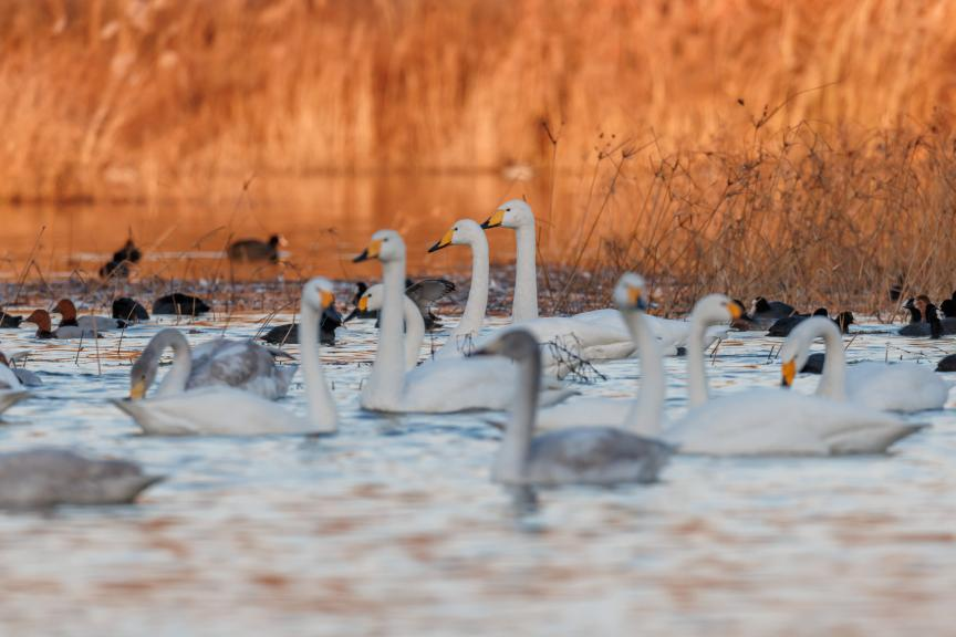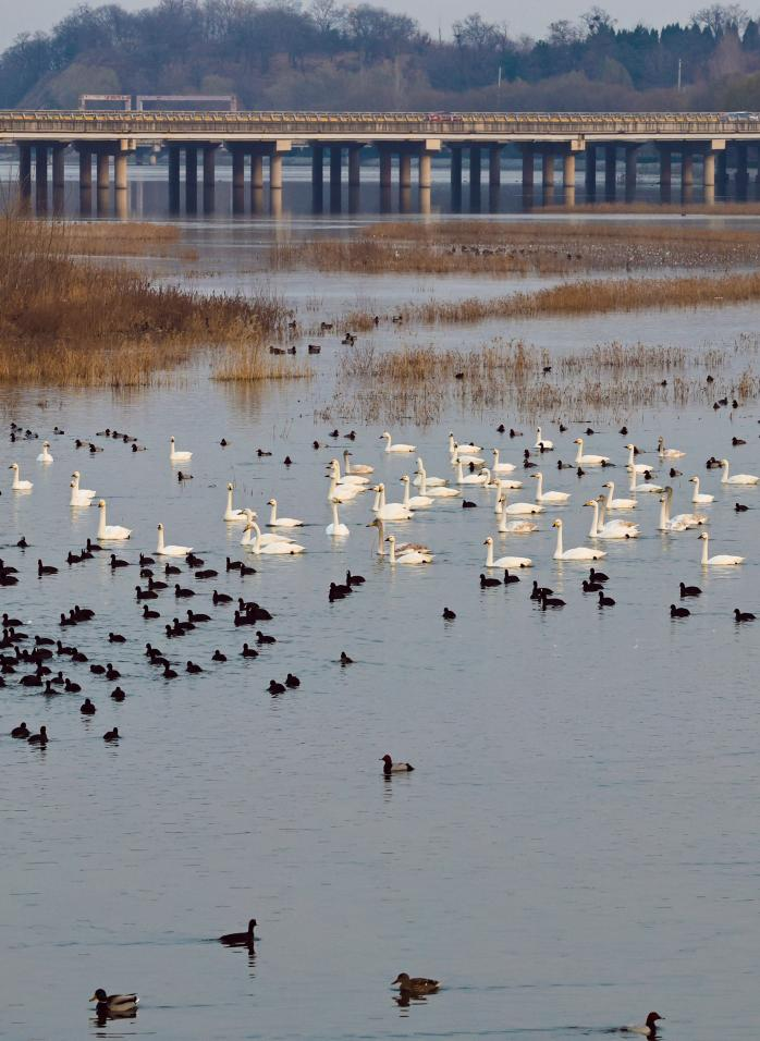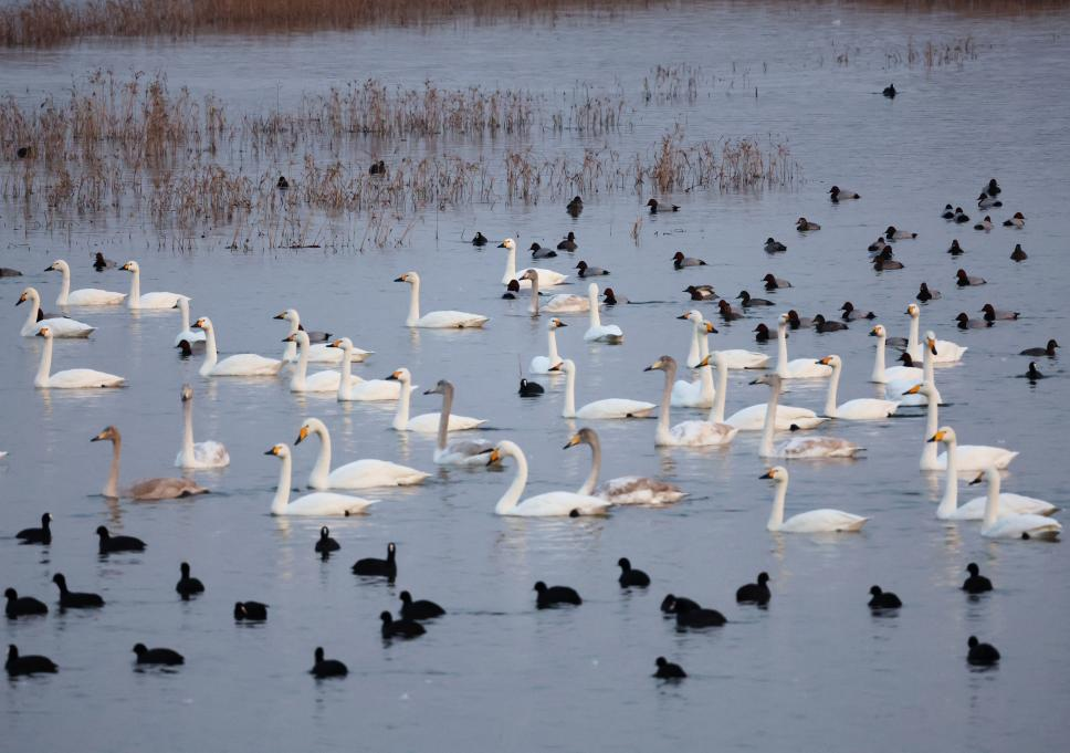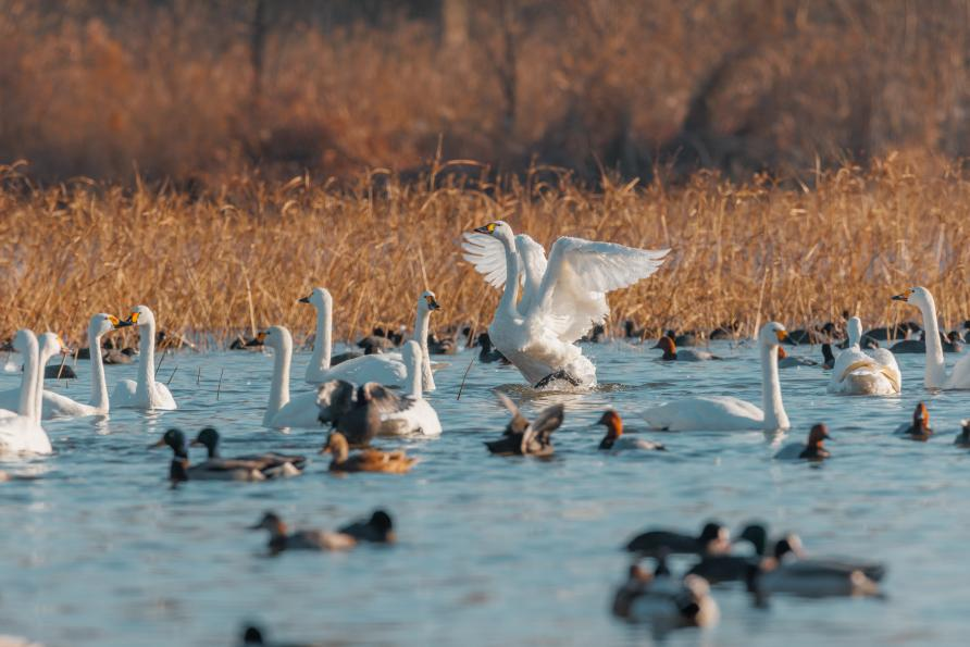 水澤之間,天鵝與水鳥成群嬉戲游動,枯葦襯著粼粼的波光。宋年升 攝
