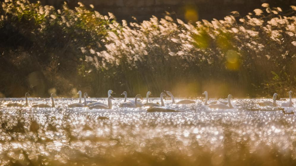 暖光灑滿水面,天鵝振翅漾開金色的水波,朦朧的葦影裹著溫柔的氣息。李冰攝