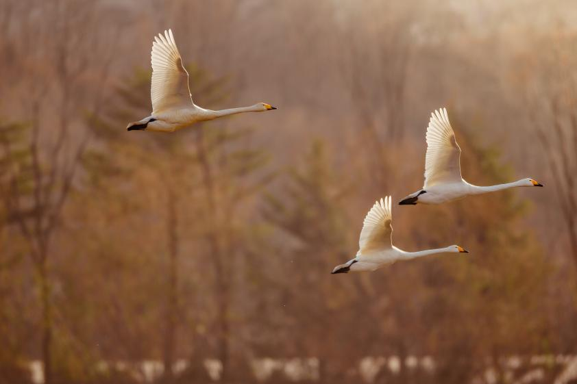三只天鵝振翅劃破柔和的風,羽翼裹著黃昏的光,舒展長頸翱翔在天際。李冰攝