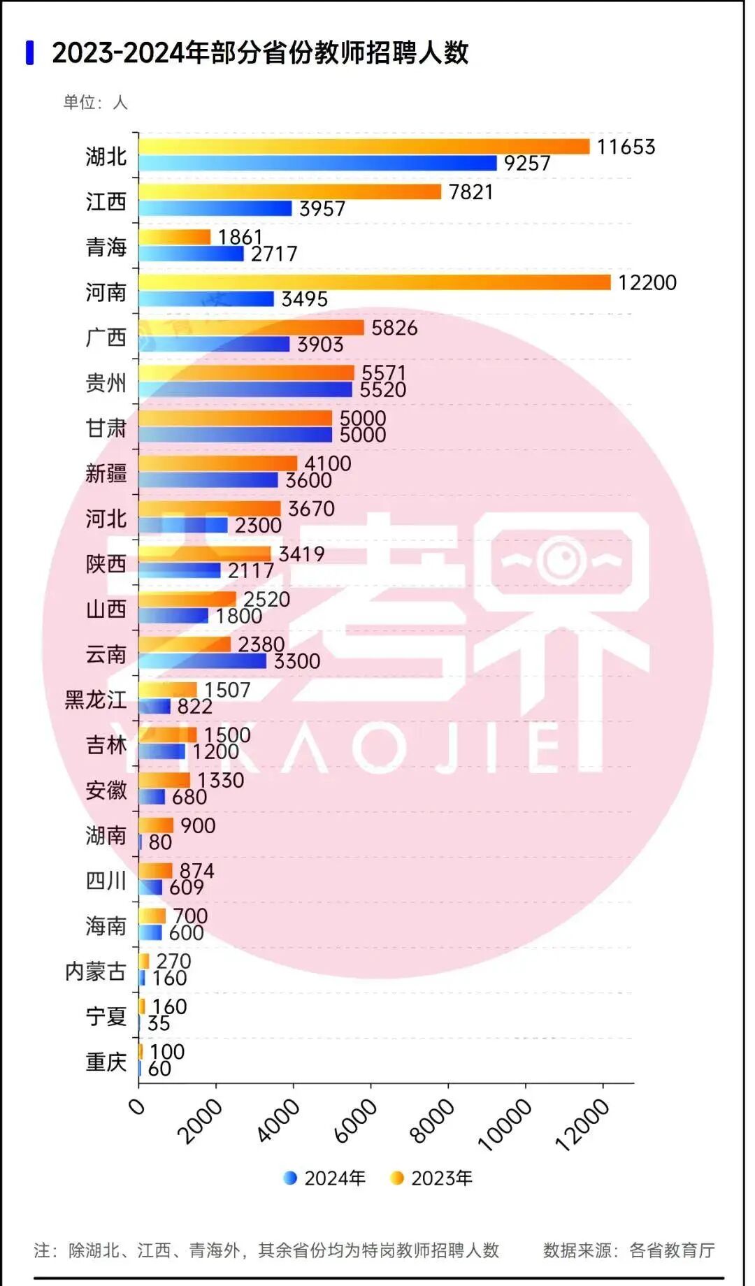 此外,近期各地陸續(xù)公布了今年“國編”中小學(xué)教師招聘計(jì)劃,多個省份的招聘計(jì)劃出現(xiàn)進(jìn)一步縮減。例如,湖北計(jì)劃招聘5878人,較去年減少36.5%;福建計(jì)劃招聘5284人,同比下降35.2%。