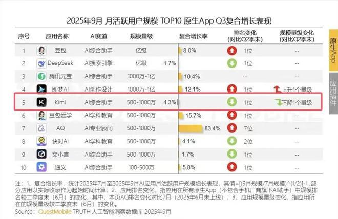 2025年9月,Kimi月活僅967萬,較九個月前下滑54%,在原生AI應(yīng)用中排名第五,月活僅為豆包的5.6%、DeepSeek的6.7%。