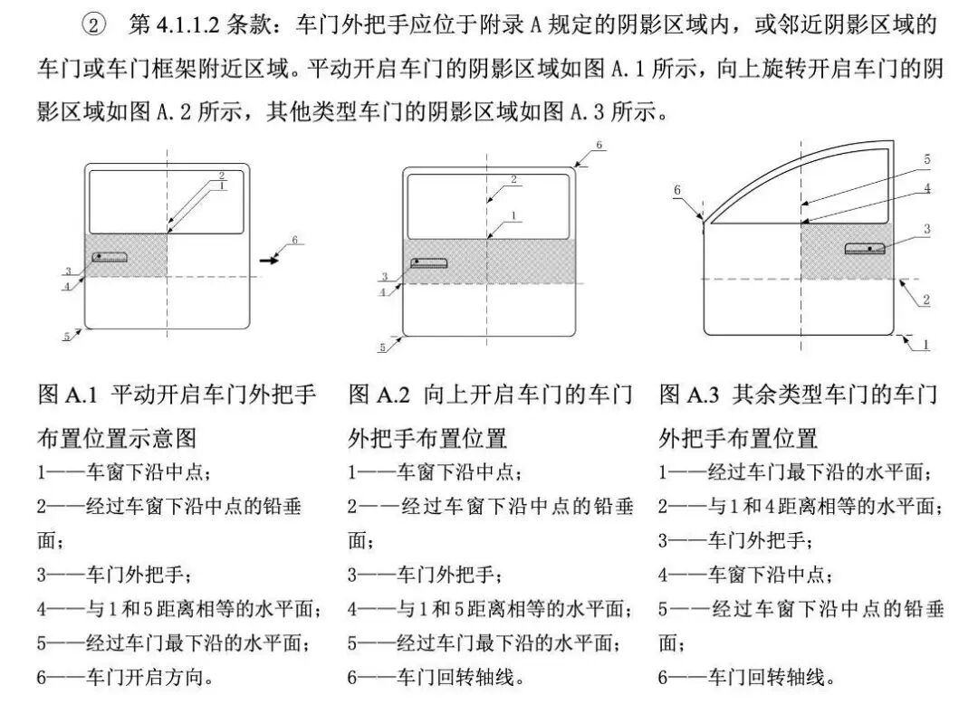新規(guī)對車內(nèi)外門把手均有詳細(xì)規(guī)定。車內(nèi)方面,除直柄式、環(huán)式、豎柄式等操作方向唯一的傳統(tǒng)機械把手外,其他形式如電子按鈕需配備永久性標(biāo)志。若操作方式不直觀,需在把手附近增加高度不小于6mm的中文或圖示說明。這意味著車企需在直觀設(shè)計與添加說明之間做出選擇。