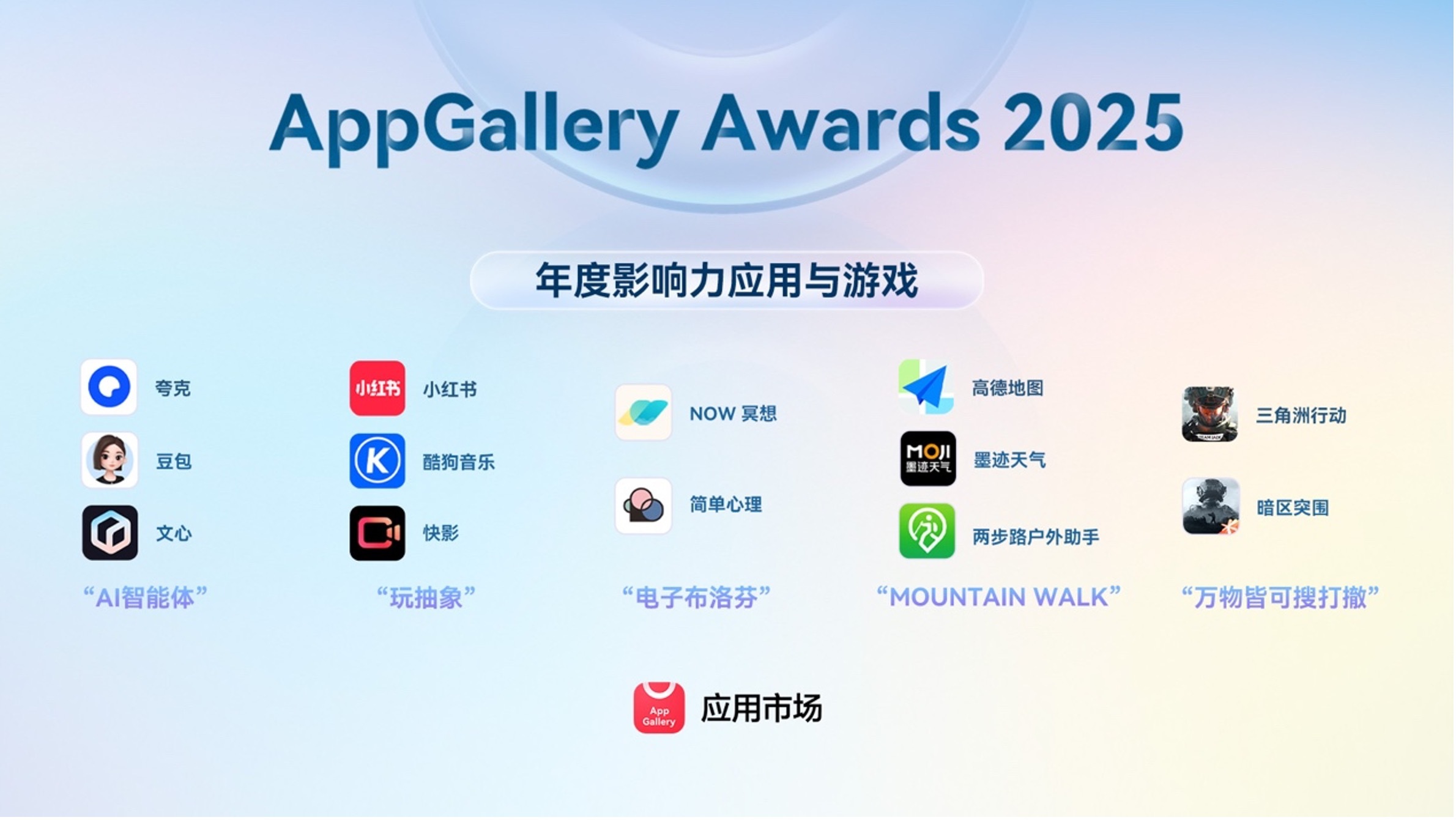 “年度影響力應用與游戲”榜單圍繞“AI智能體”“玩抽象”“電子布洛芬”“MOUNTAIN WALK”“萬物皆可搜打撤”五大前沿趨勢展開評選,《夸克》《豆包》《文心》《小紅書》《酷狗音樂》《快影》《NOW冥想》《簡單心理》《高德地圖》《墨跡天氣》《兩步路戶外助手》《三角洲行動》《暗區(qū)突圍》等應用與游戲紛紛上榜。這份榜單不僅是華為應用市場對年度社會趨勢與文化發(fā)展的深度解讀,也能幫助用戶更高效地把握數(shù)字生活的前沿熱點。