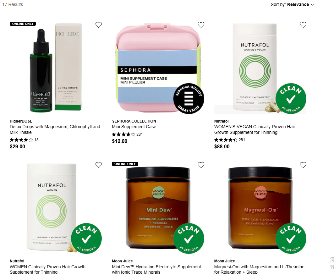 但增長態(tài)勢并未持續(xù)太久。近年來,絲芙蘭的補充劑貨架悄然變化:多個中小品牌陸續(xù)下架,品類SKU持續(xù)精簡。截至發(fā)稿前,絲芙蘭美國官網(wǎng)顯示的美容補充劑產(chǎn)品僅剩17款,不足20款,與巔峰時期的上百款形成鮮明對比。