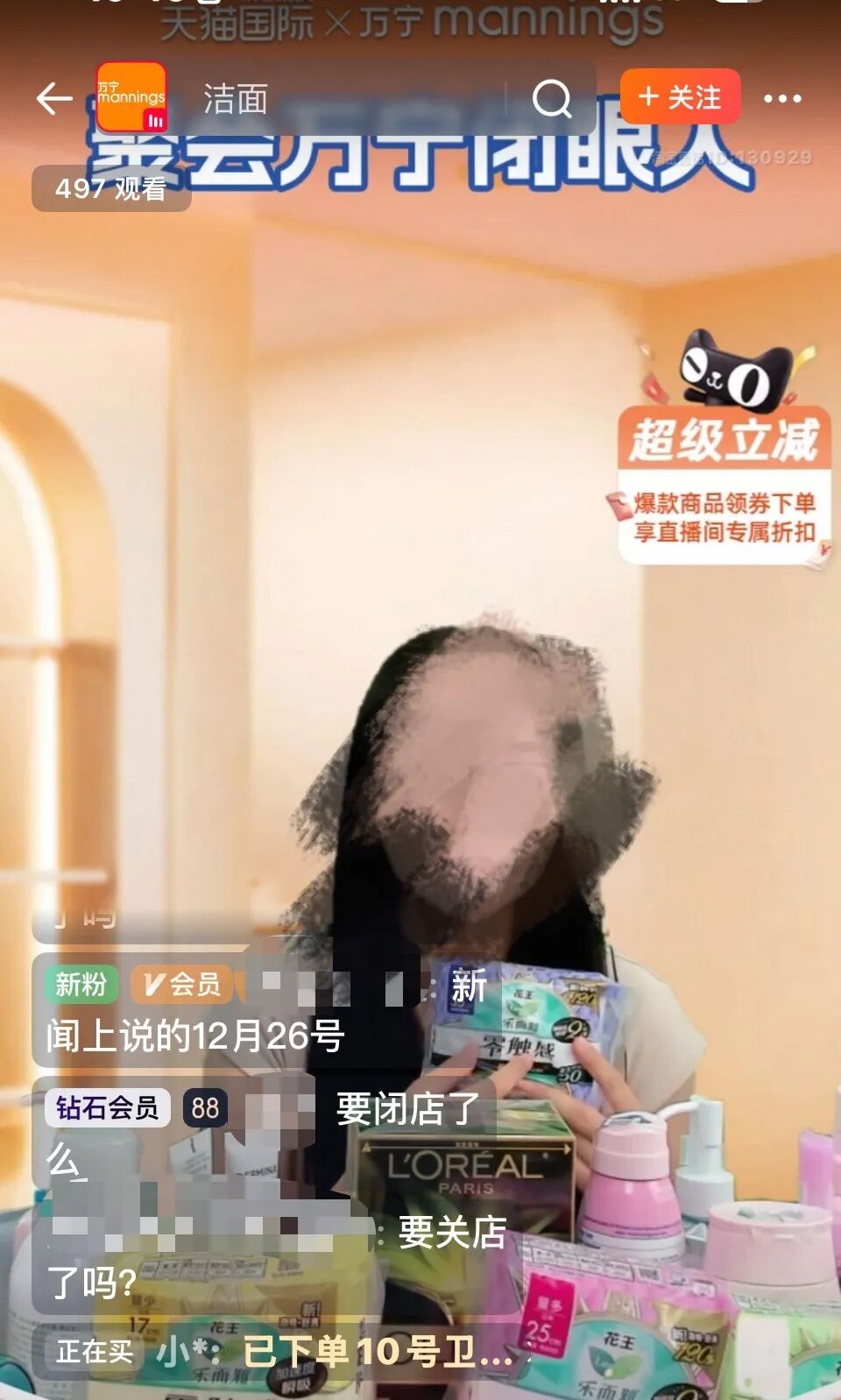 線上渠道同樣冷清。天貓“萬寧官方旗艦店”直播間疑似錄播,不時有消費者詢問關店事宜卻未獲回應;咨詢線上客服,對方也表示不清楚關店情況,但會保障售后延續(xù)。