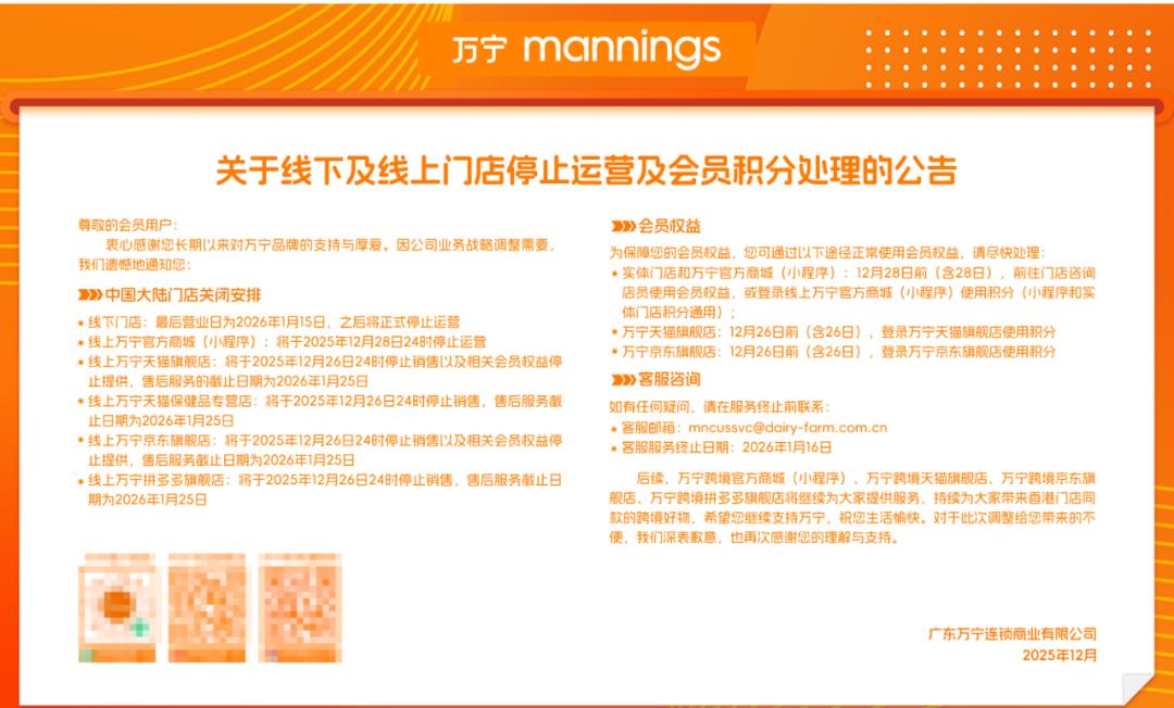 公告顯示,萬寧內地所有線下門店將于2026年1月15日終止營業(yè),線上渠道包括官方小程序、天貓、京東及拼多多等店鋪,也將在2025年12月底陸續(xù)關閉。