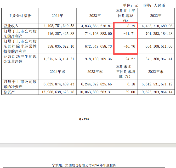 2022年至2024年,公司營(yíng)業(yè)收入分別為44.54億元、48.34億元、44.09億元;歸母凈利潤(rùn)分別為7.01億元、7.14億元、4.16億元,2024年凈利潤(rùn)同比出現(xiàn)明顯下滑。