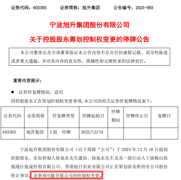 12月18日晚間,旭升集團(tuán)發(fā)布公告稱,公司控股股東、實(shí)際控制人徐旭東及其一致行動(dòng)人正籌劃所持公司股份轉(zhuǎn)讓事宜,可能導(dǎo)致公司控制權(quán)發(fā)生變更。