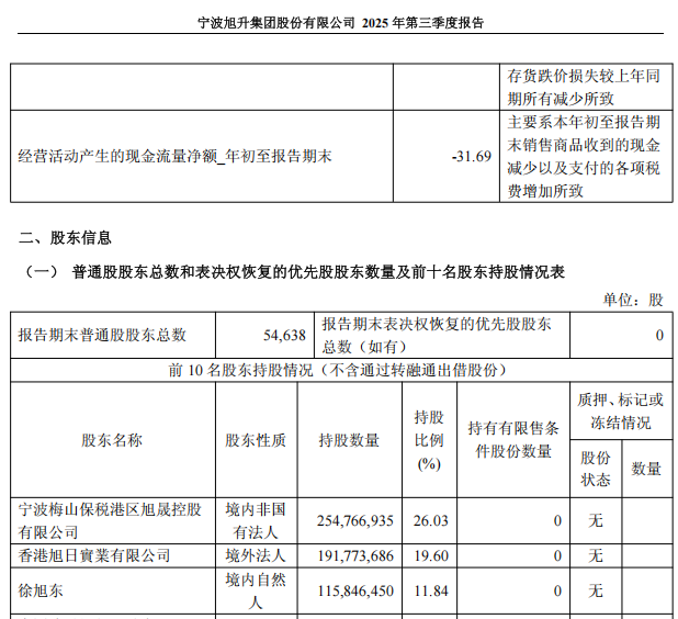 據(jù)2025年第三季度末數(shù)據(jù),旭晟控股、旭日實(shí)業(yè)、徐旭東為旭升集團(tuán)前三大股東,持股比例依次為26.03%、19.60%、11.84%。