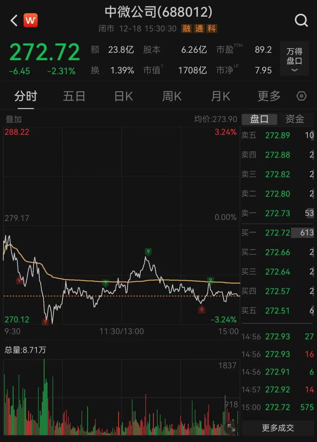 Wind數(shù)據(jù)顯示,截至12月18日收盤,中微公司股價(jià)報(bào)272.72元/股,最新市值為1708億元。