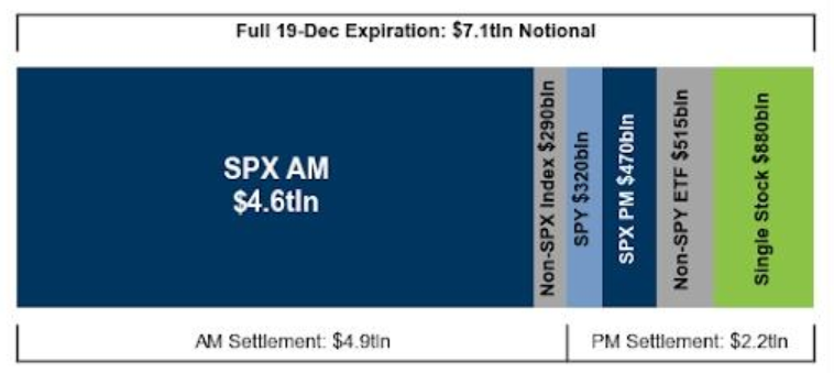 根據(jù)高盛的數(shù)據(jù),本周五將有超7.1萬億美元名義價值的期權(quán)合約到期,創(chuàng)下歷史最高紀(jì)錄。這一天被稱作“四巫日”,也就是股指期貨、股指期權(quán)、個股期貨和個股期權(quán)同時到期的日子,這種集中到期的情況往往會放大市場的交易量和波動性。