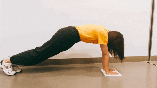 跪式俯臥撐:膝蓋著地,小腿上翹,頭、背、膝蓋呈直線,難度較小,更適合女性。