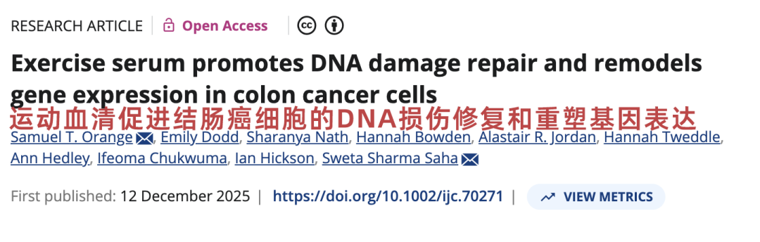 ①Exercise serum promotes DNA damage repair and remodels gene expression in colon cancer cells. Int J Cancer. Published online December 12, 2025. doi:10.1002/ijc.70271