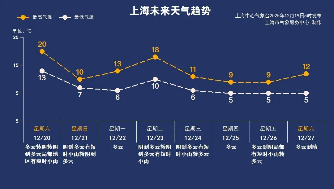 明天白天天氣依舊溫暖,預(yù)計(jì)最高氣溫仍能達(dá)到20℃。不過一股冷空氣正在醞釀,周末從東北到江南的不少地區(qū)都會(huì)出現(xiàn)氣溫的大幅變化,上海也不例外。受這股冷空氣影響,周六夜間到周日上海將經(jīng)歷一次降溫過程,同時(shí)還會(huì)伴有大風(fēng)和弱降水天氣。特別是周日,全天氣溫僅在7℃到19℃之間,和近日的溫暖體感會(huì)有明顯差異。下周初氣溫會(huì)有一次回暖,預(yù)計(jì)下周二最高氣溫仍能達(dá)到18℃,但12月23日新的一股冷空氣又會(huì)影響氣溫回升。近期氣溫波動(dòng)頻繁,提醒大家要關(guān)注氣溫變化,根據(jù)天氣情況靈活調(diào)整衣物,避免感冒。