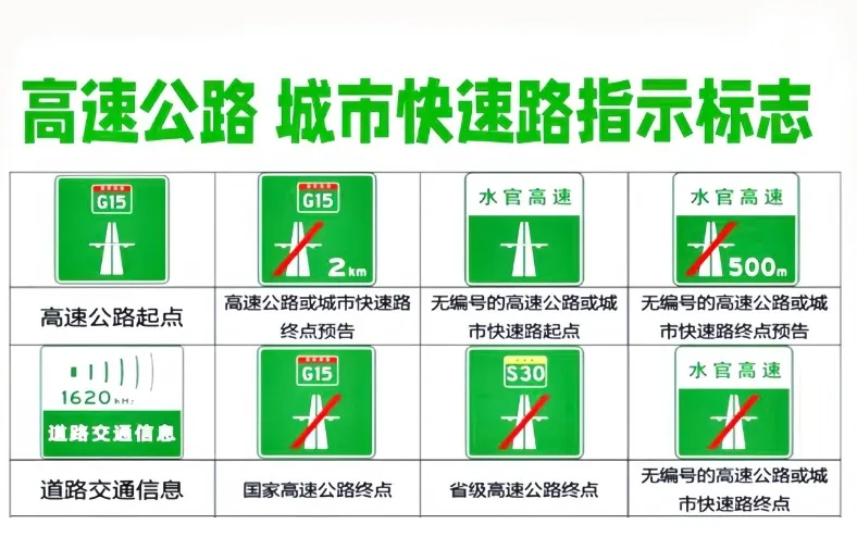 綠色標(biāo)牌:常用于高速公路和城市快速路,主要功能是傳遞道路方向、地點、距離等信息,同時也會提示服務(wù)設(shè)施的位置,幫助駕駛員規(guī)劃行程。