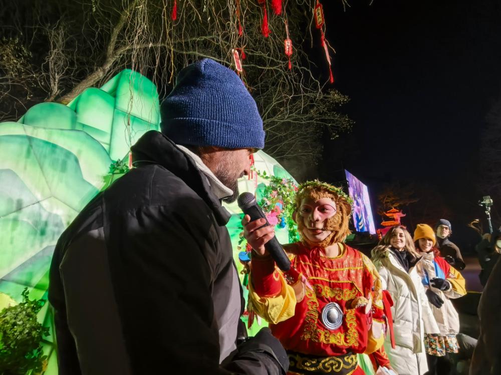 夜幕降臨,長(zhǎng)春室外溫度降至零下15攝氏度,長(zhǎng)春市動(dòng)植物公園的“五行山”前卻人頭攢動(dòng)。加拿大網(wǎng)絡(luò)達(dá)人阿蓮(ALEXANDRA LOUISE OGDEN)激動(dòng)地對(duì)園內(nèi)NPC“雪餅猴”說(shuō):“鐵柱,我來(lái)自加拿大,一直很喜歡你!”現(xiàn)場(chǎng),國(guó)內(nèi)外游客共同領(lǐng)略中國(guó)四大名著《西游記》的魅力,阿蓮與“雪餅猴”互動(dòng),一同推介吉林文旅與冰雪長(zhǎng)春,吸引了更多人圍觀,沉浸式體驗(yàn)長(zhǎng)春的文化夜生活。