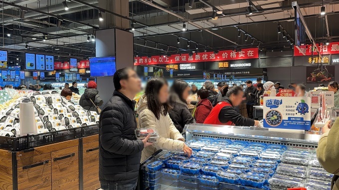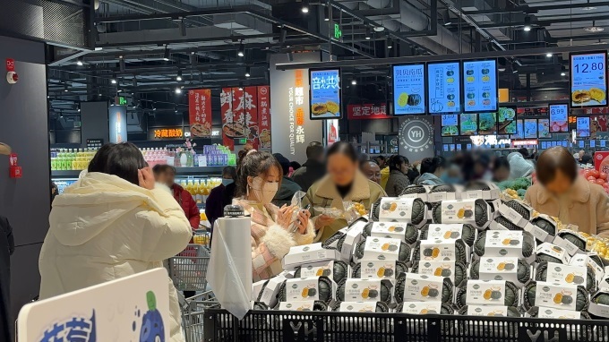 生鮮領域,門店在保障民生基礎上增加中高端商品。水果區(qū)有紅顏草莓、干堯榴蓮,還有月初海運到港的智利車厘子。這些車厘子由永輝采購團隊直采智利核心產區(qū),采摘后預冷鎖鮮,用專用包裝和0-2℃恒溫冷鏈海運,全程監(jiān)控,優(yōu)化檢疫流程,確保新鮮。水果區(qū)還推出果汁果切、水果撈等即食產品,執(zhí)行“468鮮度管理”:超4小時八折、6小時六折、8小時下架,部分熟食烘焙日清折價。
