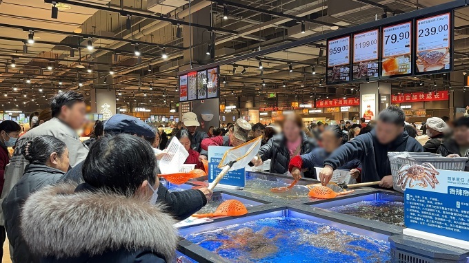品質升級的同時,門店堅守“優(yōu)質平價”。蔬菜區(qū)土豆1.59元/500g、西蘭花4.99元/500g;水果區(qū)砂糖橘4.59元/500g、紅顏草莓27.9元/250g、干堯榴蓮23.9元/500g;肉禽區(qū)冷鮮帶骨前腿肉5.99元/500g、羊排33.9元/500g、鮮牛腿肉35.9元/500g;水產區(qū)鮮活南美白對蝦29.9元/500g、小甲魚29.9元/500g、波士頓龍蝦每只(約500g)109元。這些價格得益于永輝“裸價直采”供應鏈改革,減少中間環(huán)節(jié),讓利于消費者。